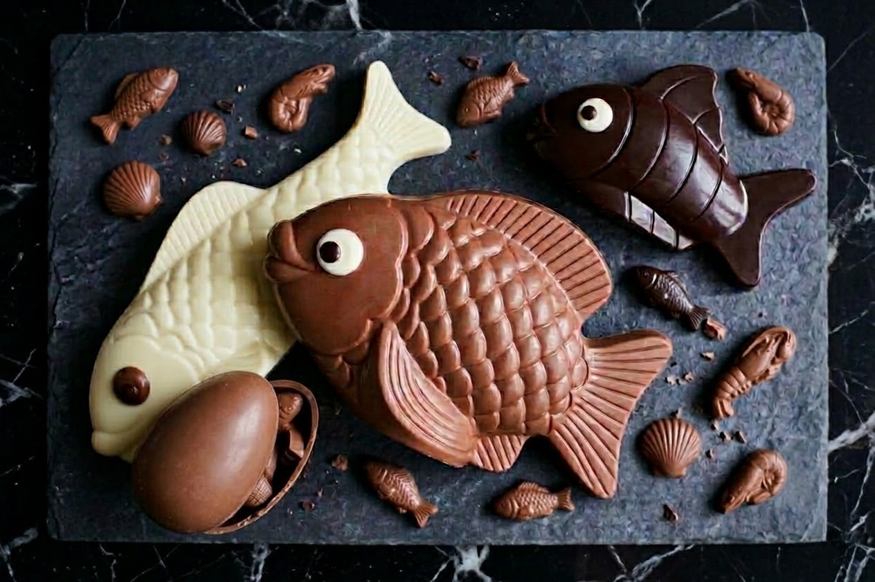 – Coffret Premium : 1 poisson chocolat 24 cm + 1 oeuf chocolat + 1 poisson 11cm + 300g de fritures