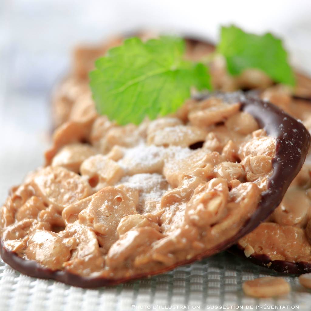 Petites bouchées croustillantes composées d’un caramel au miel et à la crème, garni d’amandes et de fruits confits.