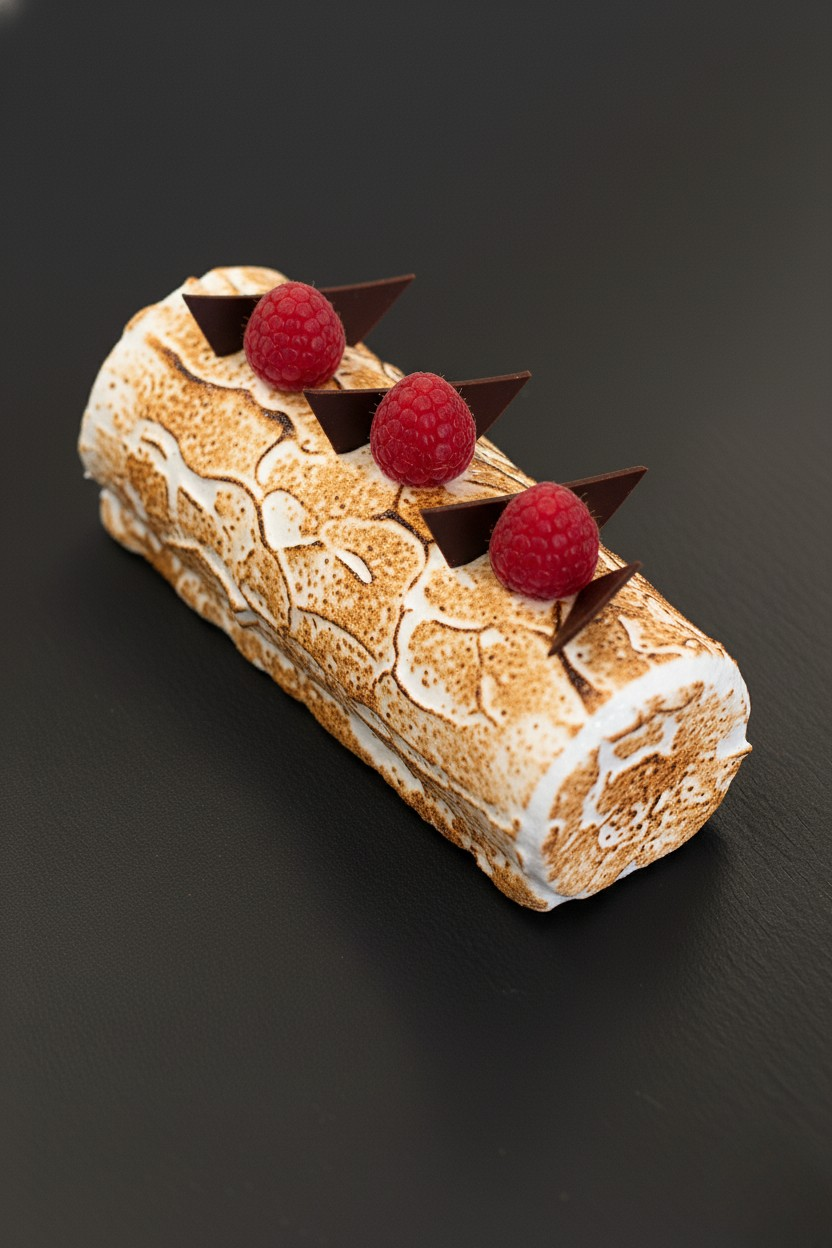 Biscuit génoise roulé, crème diplomate à la vanille, brisures de framboises. La bûche sera recouverte de meringue