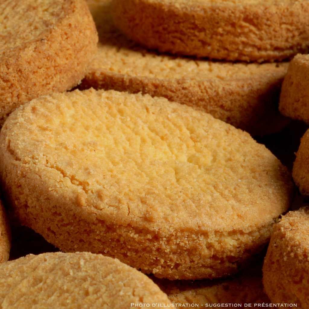Biscuit pur beurre à la texture sablée et friable, typique de la Bretagne. Riche en œufs et légèrement salé, il offre un goût authentique et fondant. Idéal seul, en base de dessert ou accompagné d’un café gourmand.